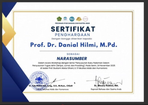 FITK NEWS – Jakarta, 24 November 2025 – Prof. Dr. Danial Hilmi, M.Pd. menjadi narasumber dalam Workshop Penulisan Tugas Akhir yang diselenggarakan oleh Program Studi Bahasa dan Sastra Arab UIN Syarif Hidayatullah Jakarta. Acara ini bertujuan untuk membekali mahasiswa dalam menulis tugas akhir dengan benar dan memperbarui Pedoman Akademik Penulisan